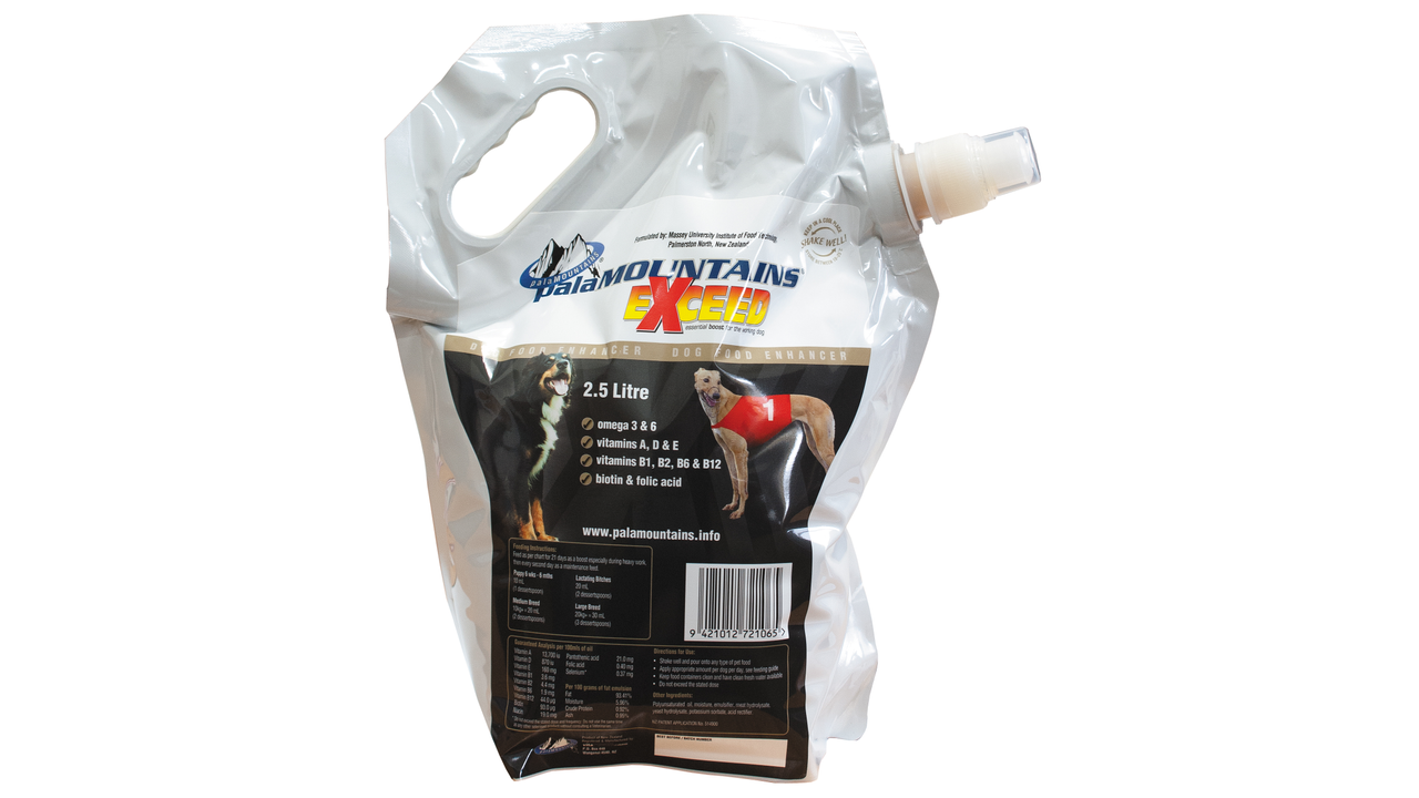 palaMOUNTAINS EXCEED offers a unique blend of omega 3 and omega 6 essential fatty acids. It also provides vital water (B1, B2, B6, B12, Biotin, Niacin, Calcium Pantothenate, Folic Acid) and fat (A, D, E) soluble vitamins at 99.5% absorption rates, along with flavourings of meat, yeast and garlic for high palatability. Massey University trials have proven that palaMOUNTAINS EXCEED also significantly improves immunity, endurance and digestion.