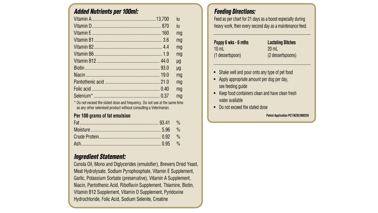 A multi-vitamin and mineral liquid supplement for working/racing dogs to improve work endurance, recovery, immunity, digestion, skin, coat and overall health.